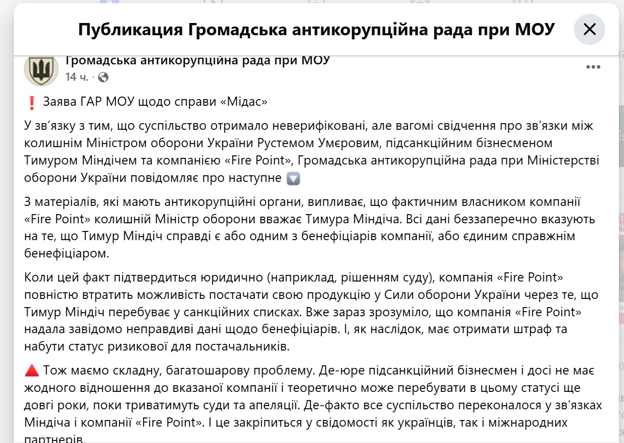 - Справа «Fire Point»: Ситуація з компанією, чиї вироби критично потрібні ЗСУ, але чий реальний бенефіціар, імовірно, підсанкційний Тимур Міндіч, створює небезпечну дилему: як забезпечити фронт, не збагачуючи при цьому схемників. Таки схеми навколо виробницва ракет шкодять їх розробці та своєчасному постачанню до ЗСУ.