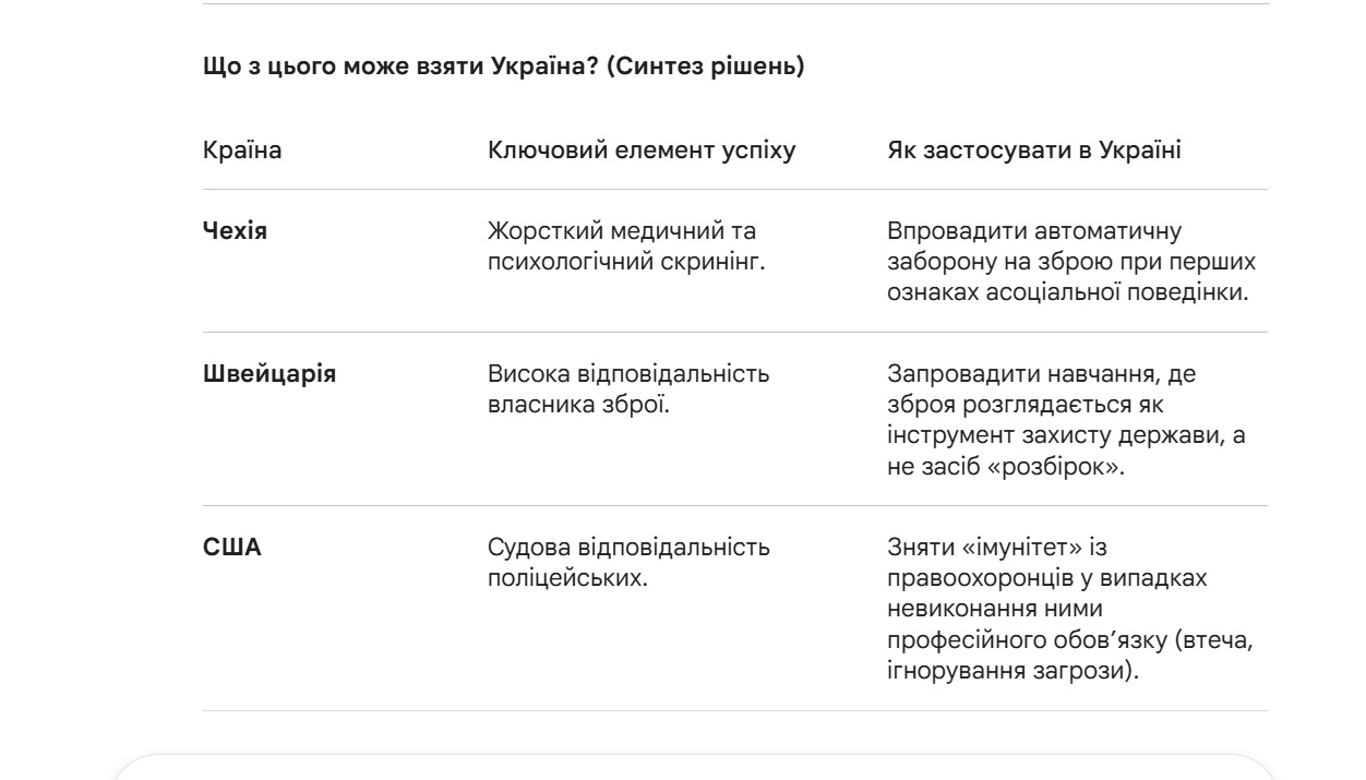 Інші країни доводять: проблема не у зброї в руках громадян, а в тому, наскільки прозорою та відповідальною є державна машина, що має цю зброю регулювати.